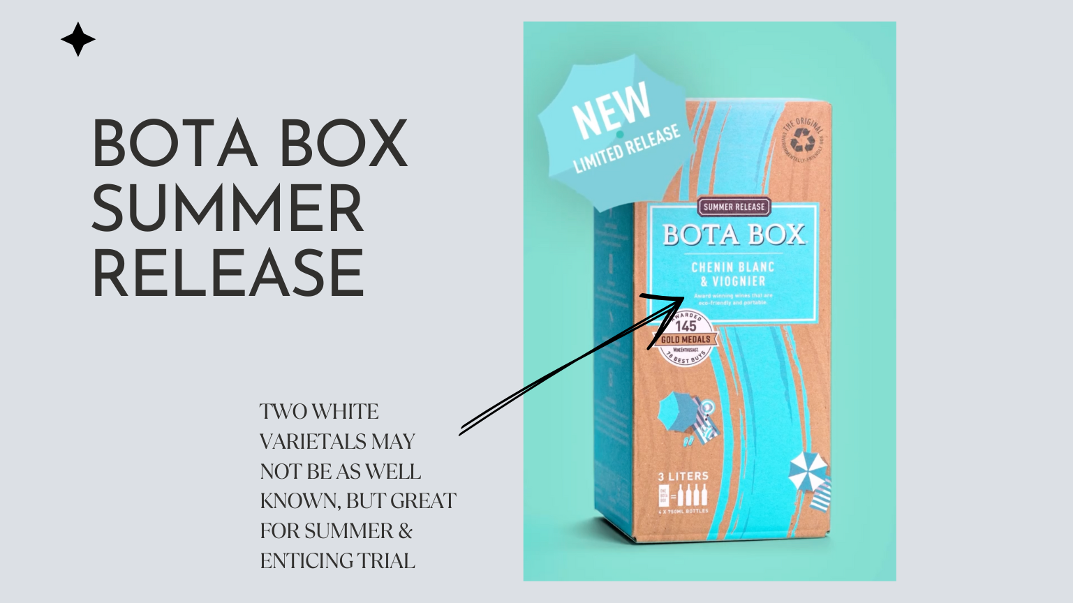 Product: While Chenin Blanc and Viognier May not be commonly knowN varietals by consumers It is a good way to educate on these blends by putting them together and communicating that they are perfect Summer Varietals.